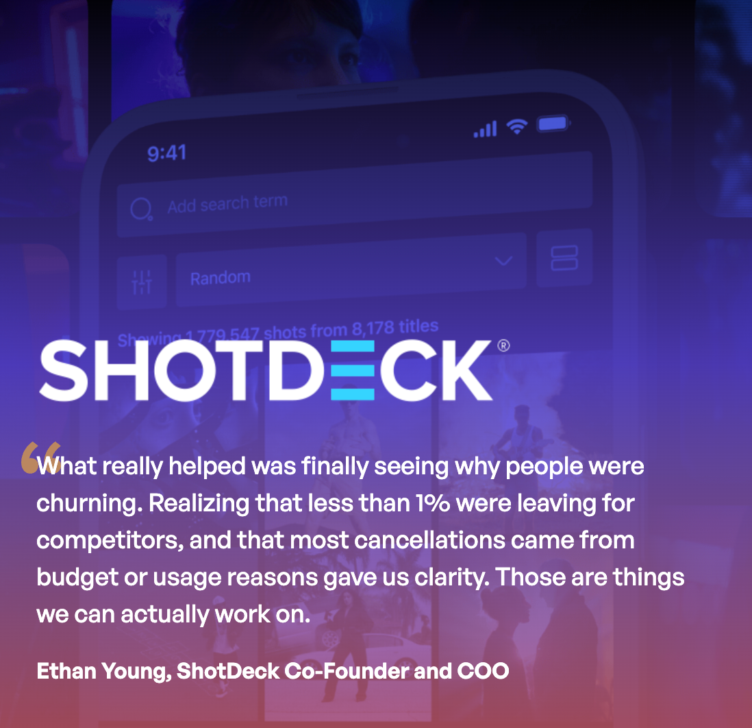 ShotDeck, the largest searchable HD movie image library in the world, confirmed this pattern after gaining visibility into their cancellation data for the first time: less than 1% of cancelling subscribers cited a competitor as their reason for leaving, while the overwhelming majority cited budget pressure or infrequent usage: two problems the team could actually fix.