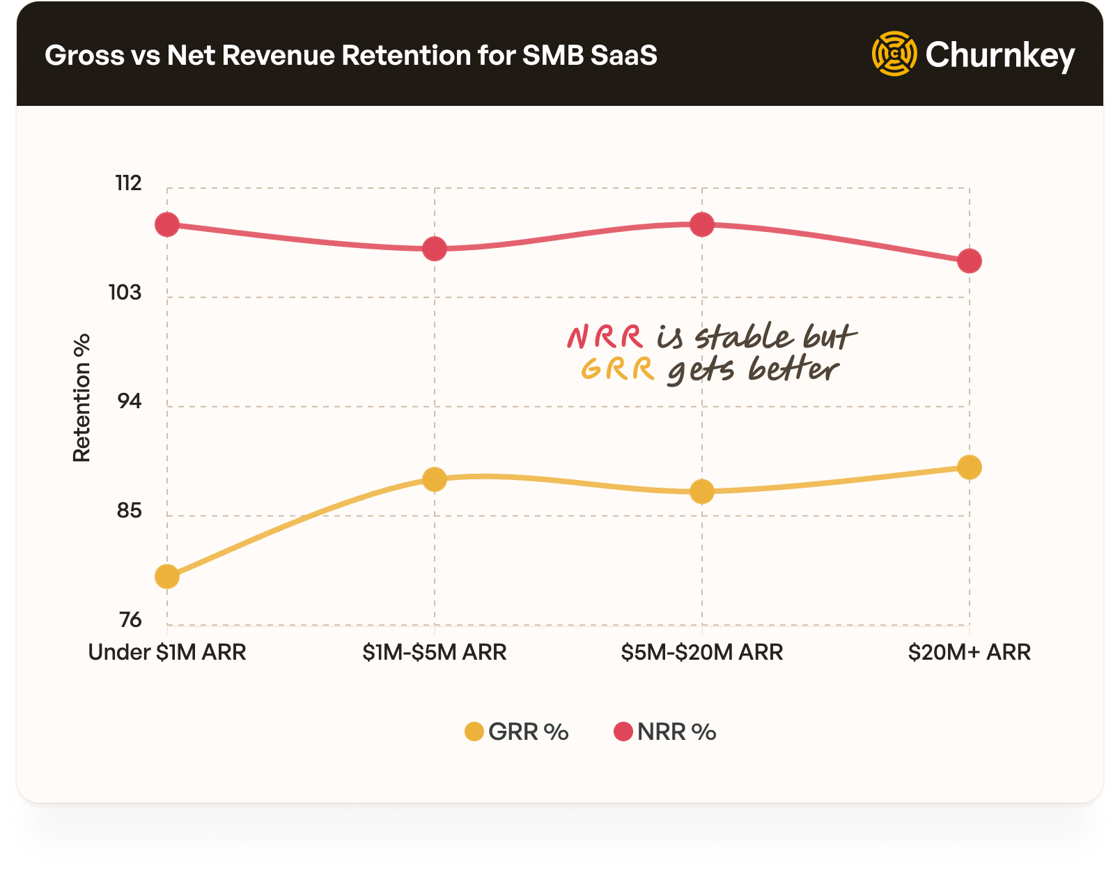 Our analysis identifies the specific gap this tactic addresses: SMB SaaS users are stickier as companies scale and GRR improves, but NRR stays flat because existing subscribers do not expand; they stay at the same tier, generating the same MRR year after year, with no structural incentive to grow inside the platform or any structural disincentive to evaluate a competitor.