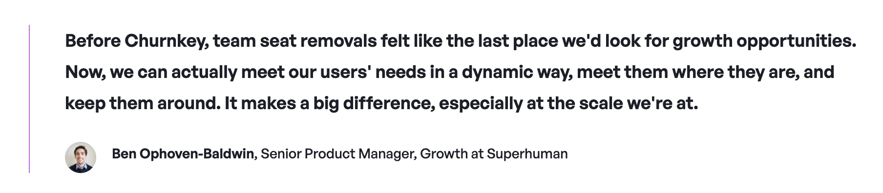 Superhuman worked with Churnkey to build a dynamic seat handoff mechanism that reduced team seat removals and closed the internal account gap a competitor could have exploited.