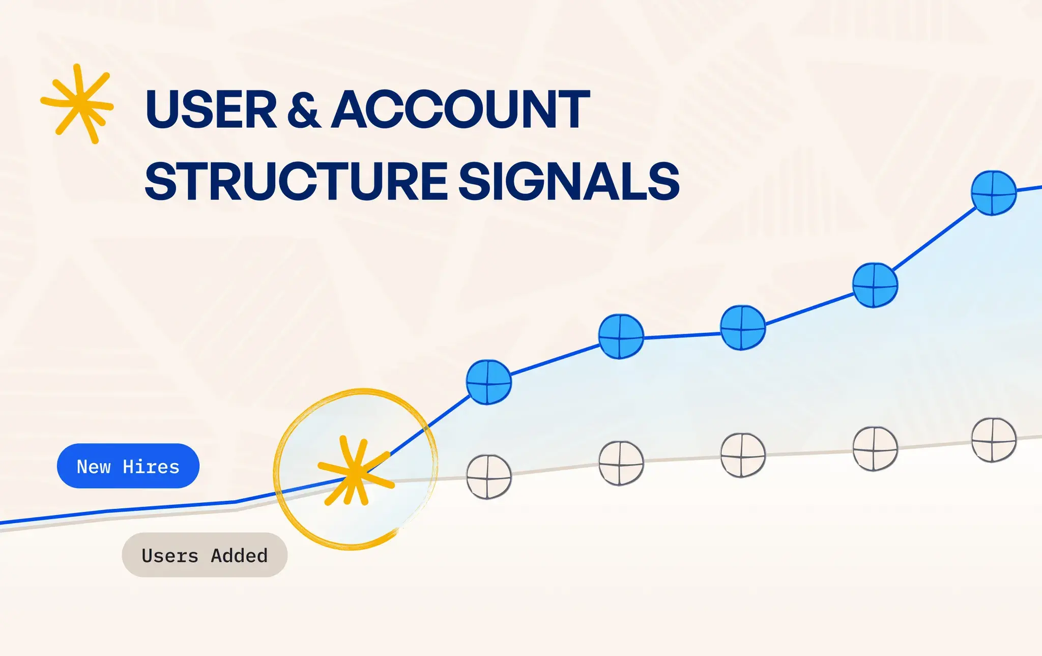 The warning pattern looks like this: a company is actively growing its team. They hired people in departments that should be using your tool: customer success, marketing, and sales; yet none of those new hires got access.