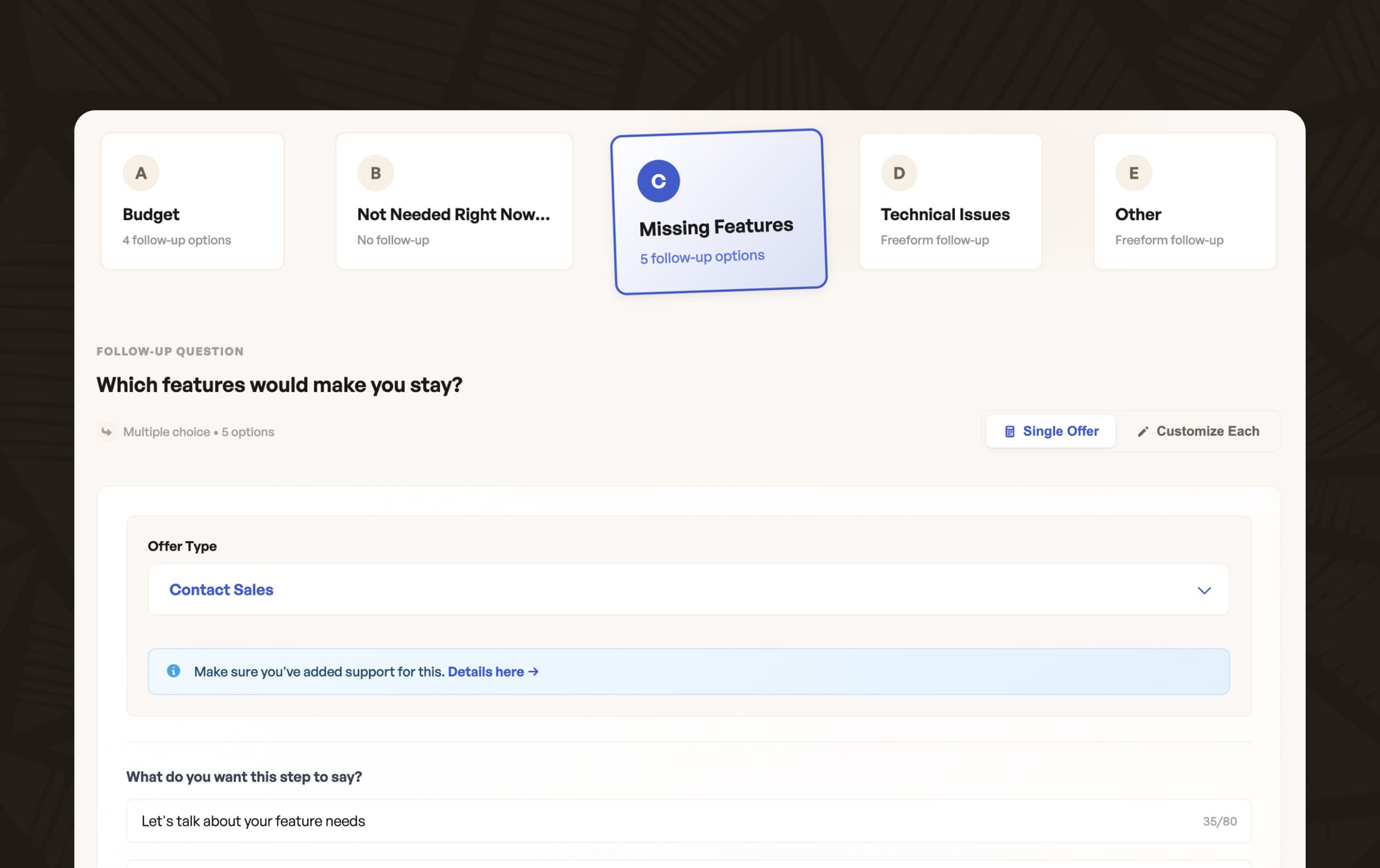 Tailored offers per follow-up answer. This is where it gets powerful. You can now configure different save offers for each individual follow-up response. Losing a customer to Competitor X, whose pricing you know? Show them a targeted discount. Customer says they're missing a feature that actually exists? Surface a tooltip or guide. The follow-up answer drives the save strategy, automatically.