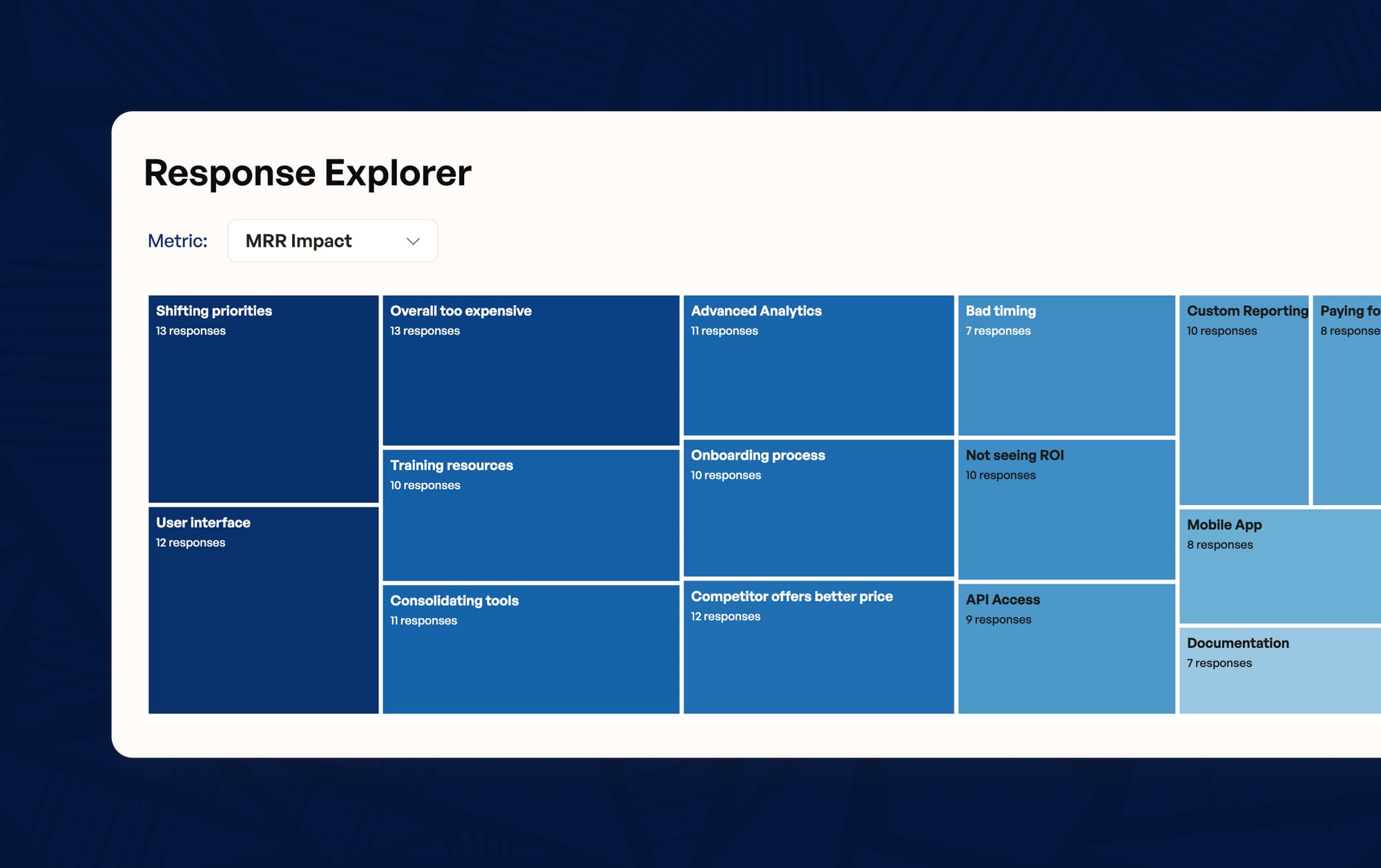 The Response Explorer. Structured responses unlock a new treemap chart in Cancel Flow analytics. Every follow-up option appears as a proportional block, sized by MRR impact or response count, so you can instantly see which answers represent the most churning revenue. Toggle between MRR and volume to shift your lens. Click any block to drill down into the sessions behind it.