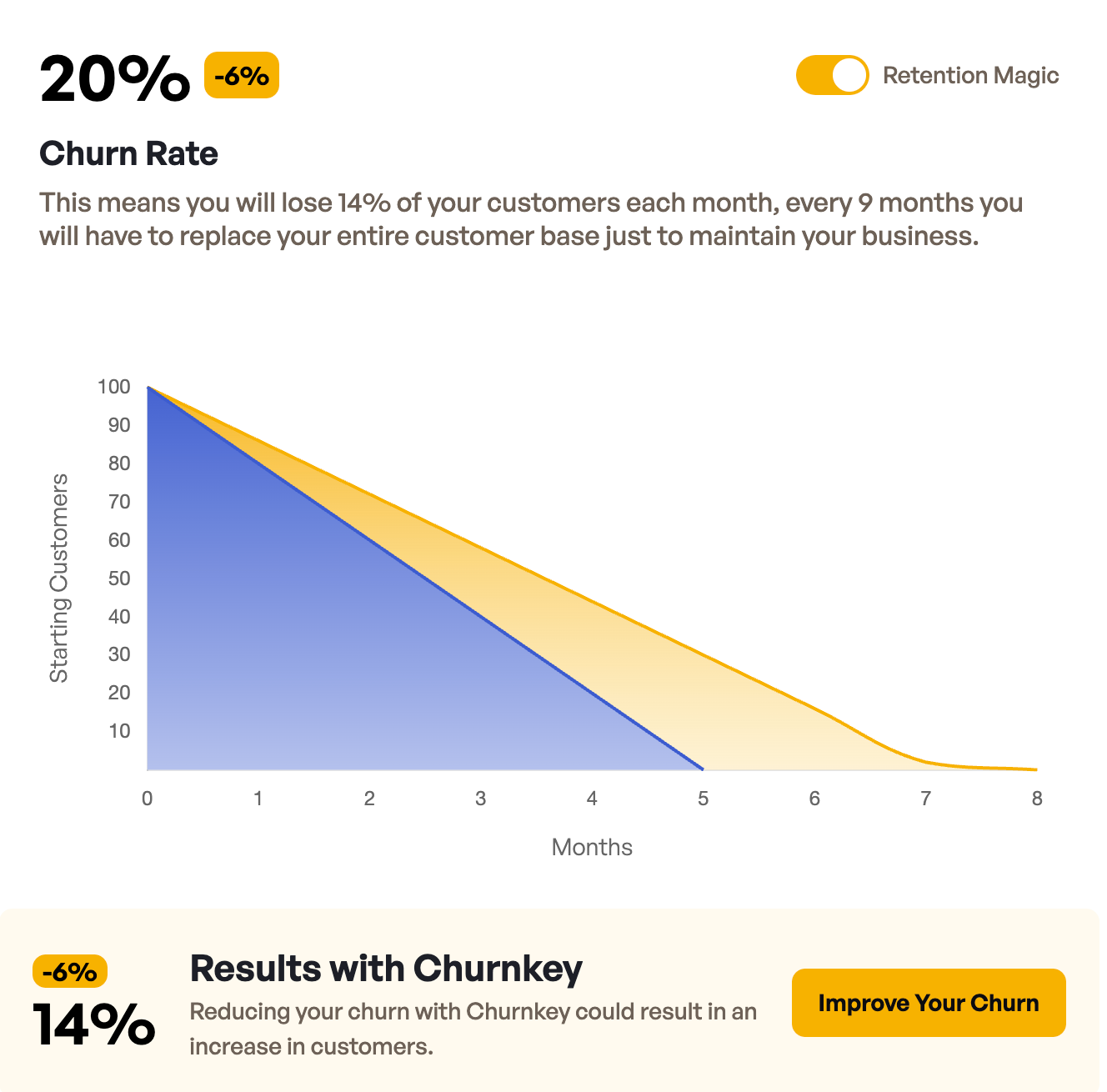 Absolute numbers can give you a false sense of security while your underlying retention is crumbling. For instance, if you gain 100 customers but lose 20, your dashboard shows a net gain of 80, which looks fine on first glance. However, your business is actually fighting a 20% churn rate that will bankrupt your acquisition budget sooner than you think. Use the Churnkey churn rate calculator to check your current numbers.